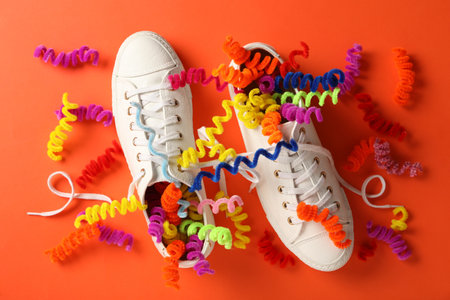 Shoes with colorful decorative spirals on orange background, flat lay. April fool's day