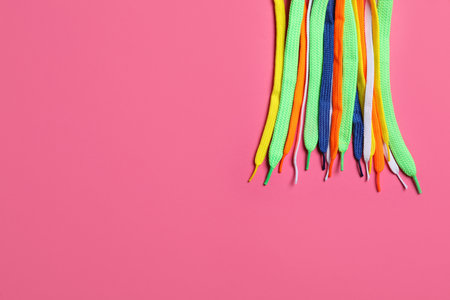 Colorful shoelaces on pink background, flat lay. Space for text