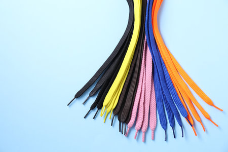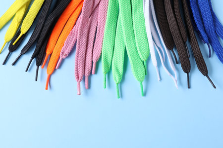 Many colorful shoe laces on light blue background, flat lay. Space for text