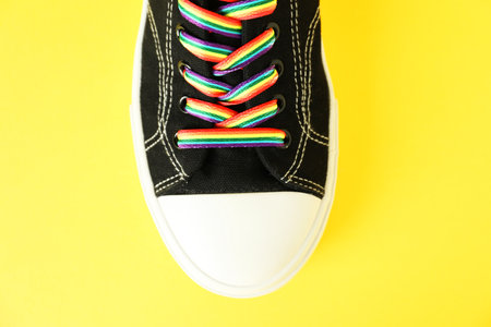 Black shoe with bright rainbow lace on yellow background, top view. LGBT concept