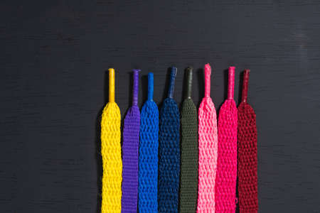 background of colored shoelaces on black wood, arranged vertically, concept of perfection, leaving space for advertising text