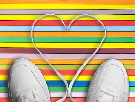 Close-up of rainbow shoelaces on a person's shoes, representing LGBT pride and personal expression