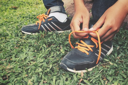 Close-up of the laces of a runner athlete's training shoe.