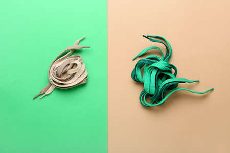 Different shoelaces on color background