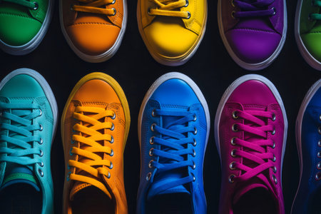 Collection of vibrant sneakers arranged neatly, showcasing a spectrum of colors on a dark surface