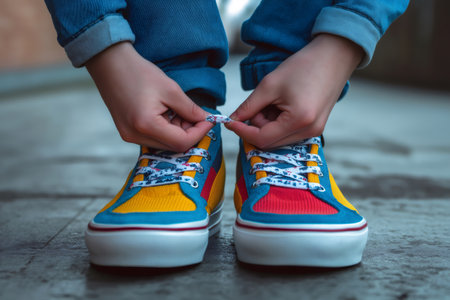 Close up view of a teenager wearing vibrant shoelaces on colorful sneakers, showcasing a trendy and casual street style in urban fashion