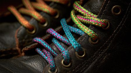 This image showcases a close-up view of vibrant shoelaces threaded through vintage leather boots, highlighting intricate stitching and rich textures, ideal for fashion themes.