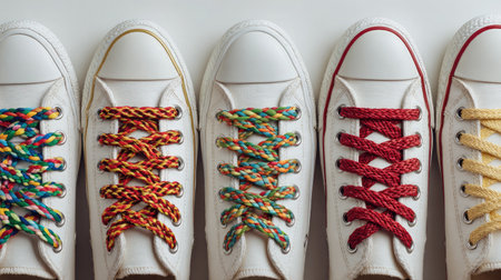 A stylish arrangement of casual white sneakers featuring colorful laces. This image highlights vibrant patterns and playful designs perfect for fashion-forward individuals seeking unique footwear.