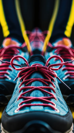 This close-up image showcases colorful shoelaces tied in a knot on a stylish athletic shoe, highlighting intricate textures and design details.