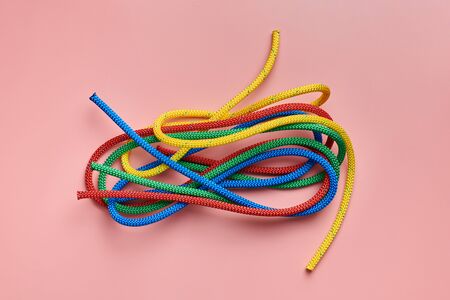 Braided nylon rope bundle. Red, green, blue and yellow ropes skein. Strong and reliable fastening for marine boats, sailing, mountaineering and hiking.