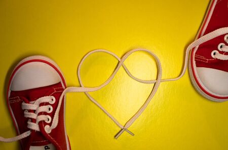 yellow gym shoes on a wooden floor, in which the laces are in the form of heart