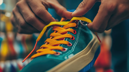 The shoe seller skillfully laces a pair of vibrant sneakers, highlighting the colorful shoelaces and eyelets. Soft focus enhances the lively atmosphere of the shop.