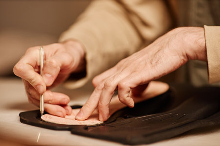 Focus on hands of young male shoemaker outlining sole workpiece while standing by workplace and creating new footwear in workshop
