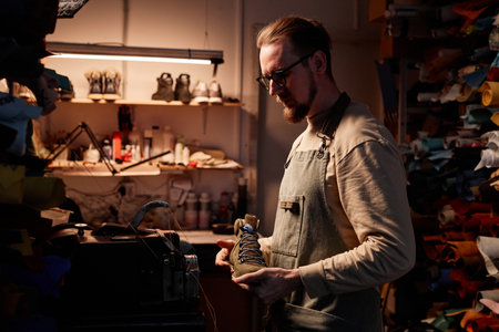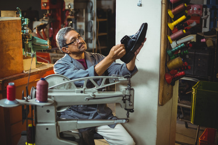 Shoemaker examining a shoe in workshop