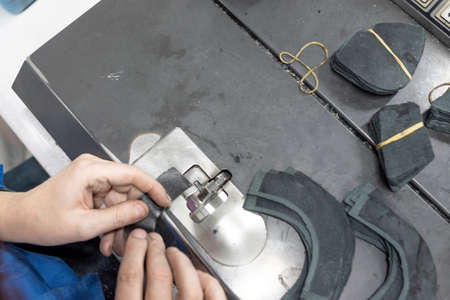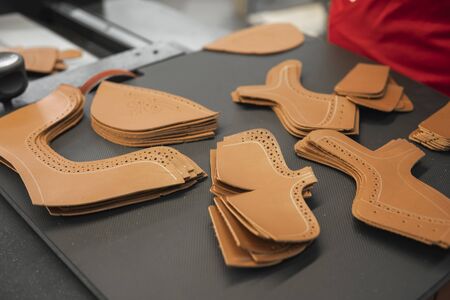 Different forms of leather pieces which will be use for making a shoes on a shoes factory. Prepared, bundled leather parts, used in the production of shoes