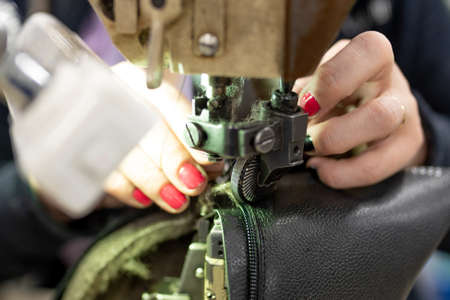 Sewing machine in a leather workshop in action with hands working on a leather details for shoes. Women's hands with sewing machine at shoes factory