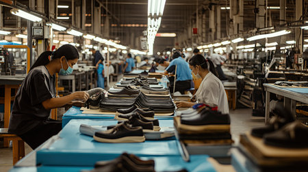 Skilled artisan examines a leather sole with a measuring tape in a busy shoemaking workshop