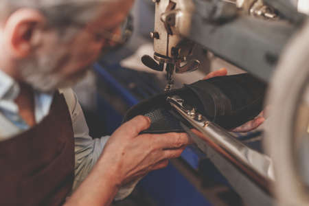 Elderly specialist stitching shoes on leather sewing machine at plant