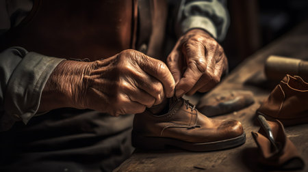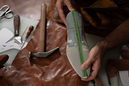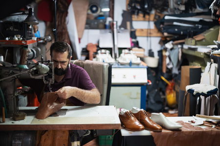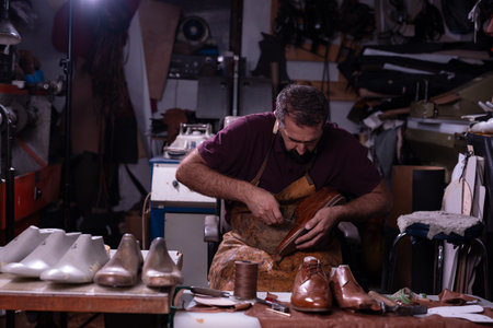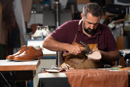 Cobbler at work in a leather workshop crafting a shoe by hand with tools nearby