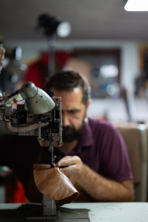 cobbler stitching parts of a shoe in one piece on tailoring machine