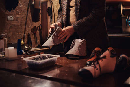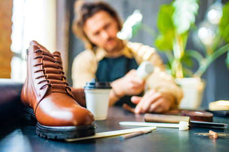 Shoemaker artisan at work. Vintage master workshop for the production of shoes. Repair boots in the old days.
