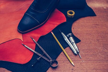 Shoemaker's work desk. Tools and leather at cobbler workplace. Man classic black shoes, leather shoemaking tools and set of leather craft tools . Shoes maker tools on wooden table