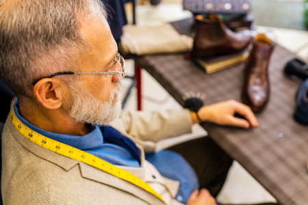 Moustached footwear artisan making luxury handmade male shoes in small footwear workshop studio. Small bisuness and handicraft, footwear manufacturing Concept