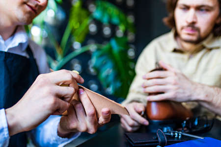 hobby became a small business leather man in apron is making a leather wallet and shooes in studio