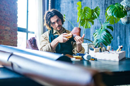 Closeup photo shoot of talented leather designer at his workshop.