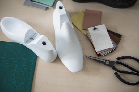 Image of shoes and instruments on table at footwear workshop.