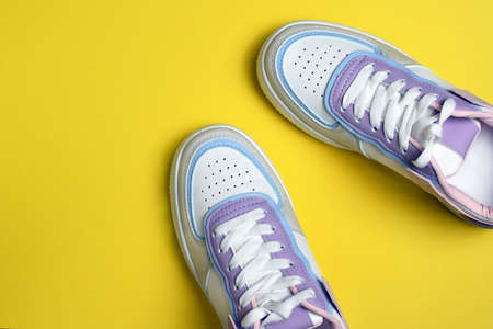Fashionable women's sneakers for every day on a bright yellow background. Sports boots. minimal composition. Top view, flat lay.
