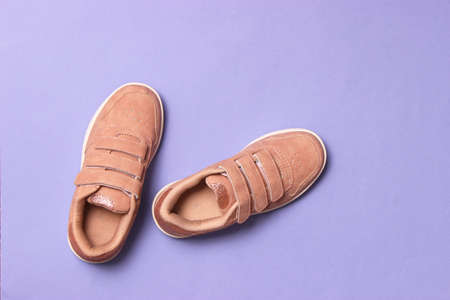 Pair of sport shoes on colorful background. New sneakers on pink, blue and yellow background, copy space.