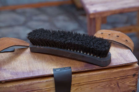 Large black Horse Hair Shoe Brush and polishing shoes on a wooden table . Shoe brush on wooden table. Footwear care item .