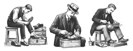 men polishing shoes using brushes and polish kits Set collection bundle sketch engraving generative ai vector illustration. Scratch board imitation. Black and white image.