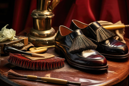 Black lacquered shoes and shoe care set, brush, shoe spoon and polishing cloth, stylized