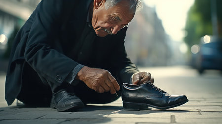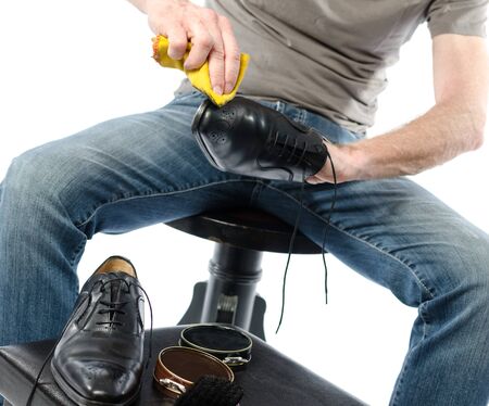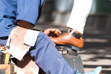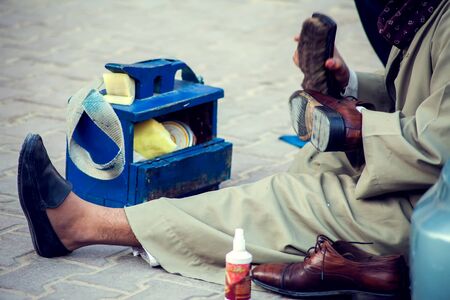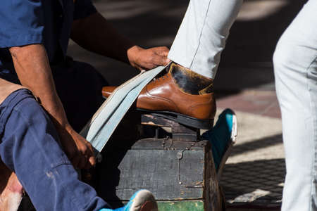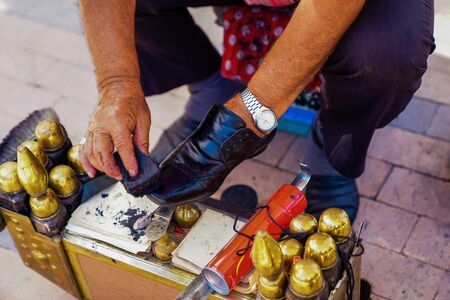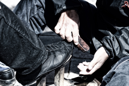 Ancient method of shoe cleaning. Man cleans shoes with help of shoe polish on street, close up.