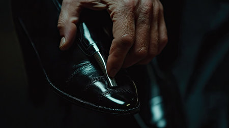 A close-up image capturing the detailed process of polishing a classic black leather shoe, showcasing craftsmanship and elegance in footwear care.