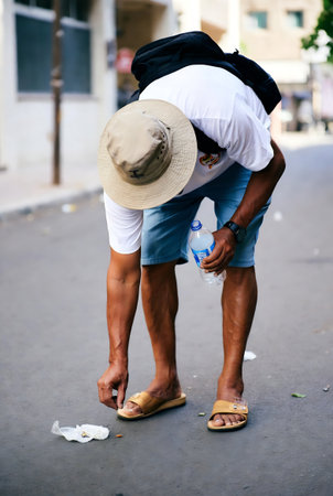 Homeless man with dirty shoes and straw hat kneeling on the street