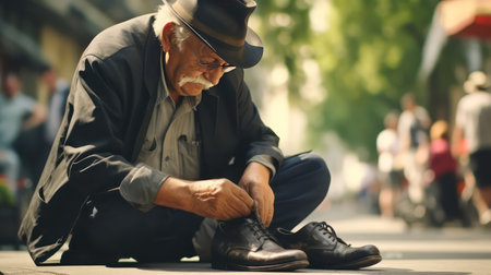 Old man in a hat and glasses sitting on the ground and tying his shoelaces