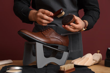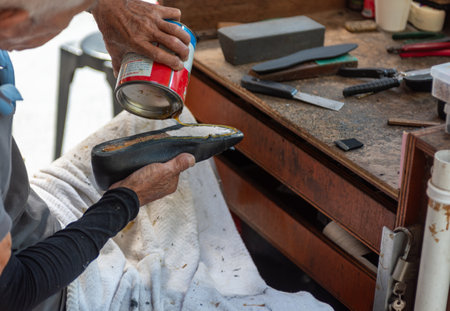 Close-up top view of shoemaker painting heel and sole of light brown leather shoes with brush during restoration working. Concept of cobbler artisan repairing and restoration work in shoe repair shop.