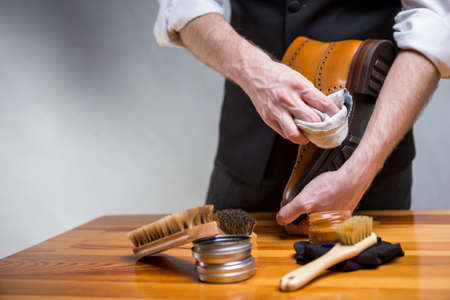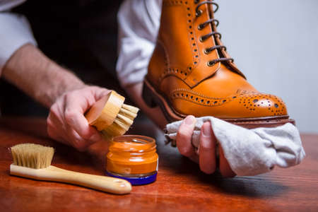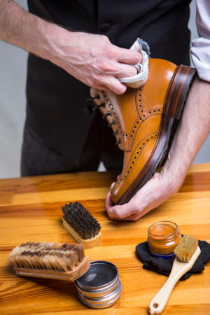brown male shoes with accessories for care. fmale Hand cleaning a male boots, close-up. shoe care concept