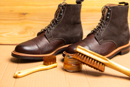 Various Shoes Cleaning Accessories for Dark Brown Grain Brogue Derby Boots Made of Calf Leather with Special Tools. Horizontal Image Orientation