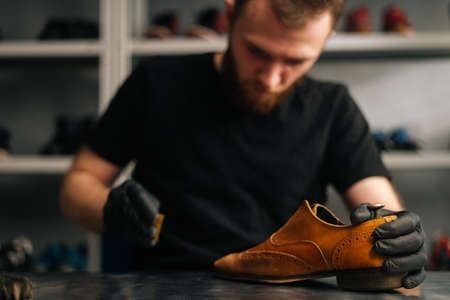 Front view of shoemaker wearing black latex gloves polishing old light brown leather shoes for later restoration. Concept of cobbler artisan repairing and restoration work in shoe repair shop.