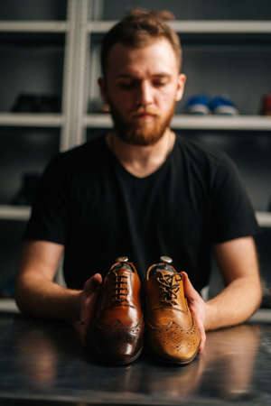 Portrait of male shoemaker holds old light brown leather shoe and repaired shiny shoes after restoration working. Concept of cobbler artisan repairing and restoration work in shoe repair shop.