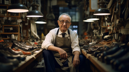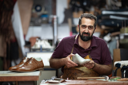Skilled shoemaker craftsman handcrafting leather shoe in a busy workshop studio