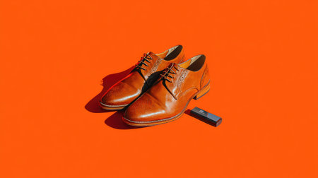 Two brown leather shoes sit prominently on a vivid orange surface. The composition features strong shadows and highlights, emphasizing textures and details. The lighting suggests an outdoor setting, potentially a sunny day. This image may be suitable for advertising, fashion editorials, and various commercial applications.