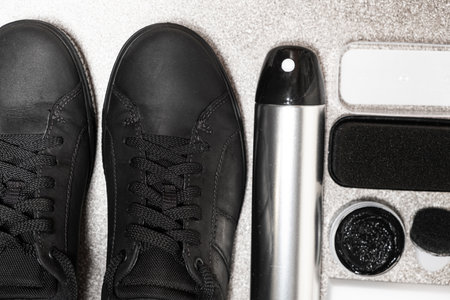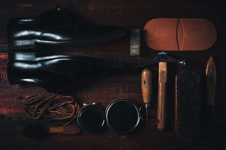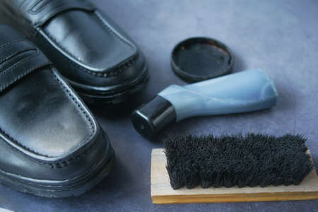 Black shoe polish, brush and shoes on the table. Accessories for cleaning leather footwear. Dark background.