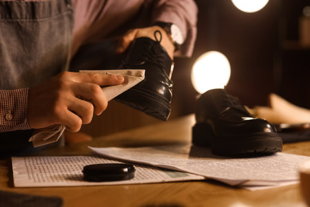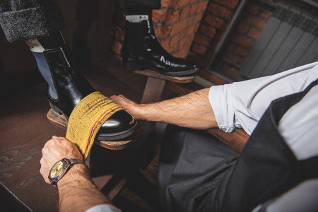 Top close-up view of professional shoemaker wearing black gloves polishing old light brown leather shoes. Concept of cobbler artisan repairing and restoration work in shoe repair shop.