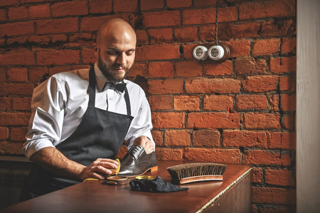 bald man in uniform sitting at his workspace in front of shoe shine equipment