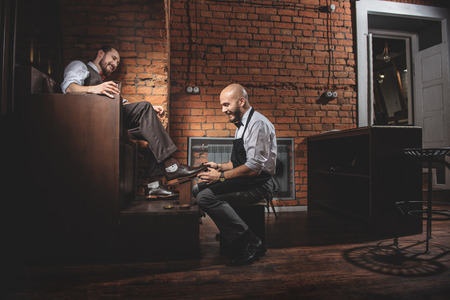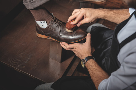 man gets his shoes polished by a craftsman using a vintage camel hair brushes on a wooden shoe platform